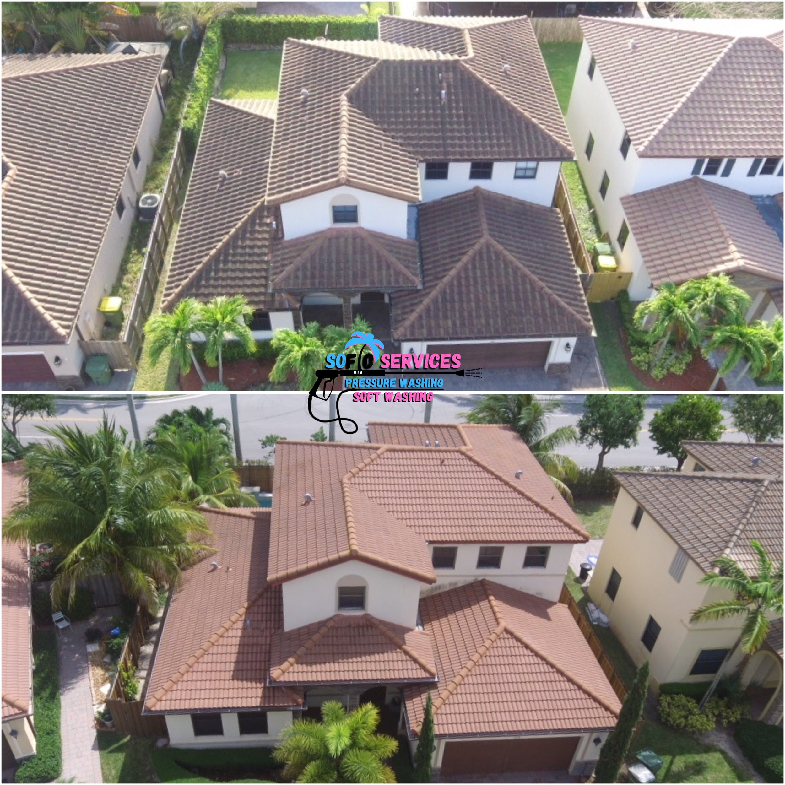 At SoFlo Services MIA our roof softwashing services effectively remove mold, mildew, dirt, and debris from your roof's surface without causing damage. This process ensures that your roof remains clean and free of contaminants, extending its lifespan and preserving its appearance. Our team utilizes specialized equipment and eco-friendly cleaning solutions to deliver thorough and safe results. Whether you have a shingle, tile, metal, or flat roof, our softwashing service is tailored to suit various roofing materials. Trust us to enhance the curb appeal and longevity of your roof with our professional softwashing services.